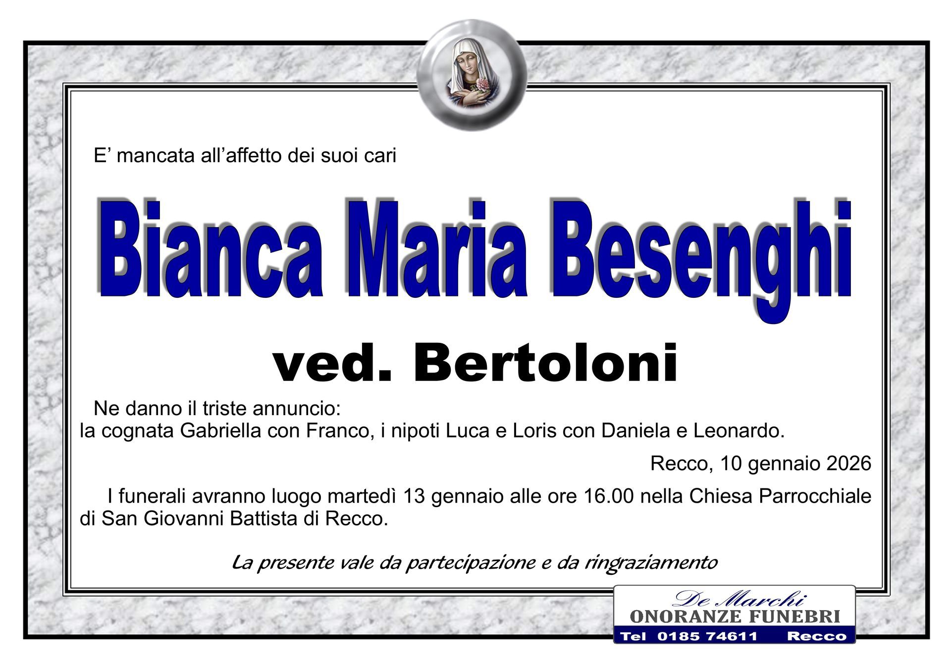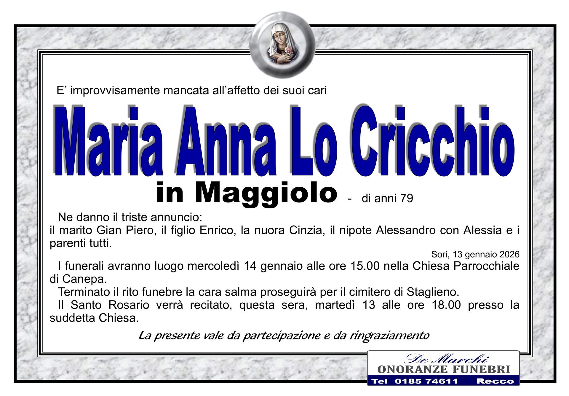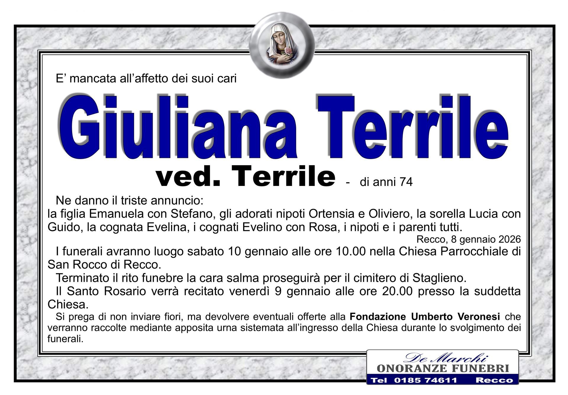 Potete contare sulla professionalità ed esperienza dell’agenzia funebre De Marchi per la stesura e l’affissione di comunicazioni di lutto, per lo svolgimento delle pratiche cimiteriali, per il trasporto della salma da un comune a un altro e per la gestione di qualsiasi aspetto del rito funebre.