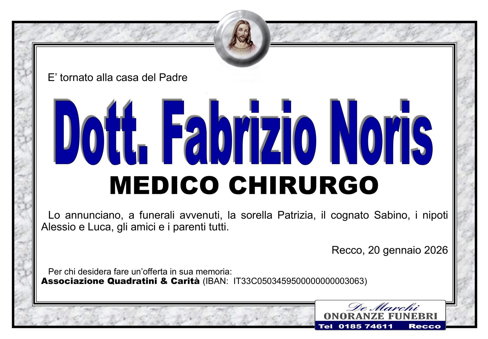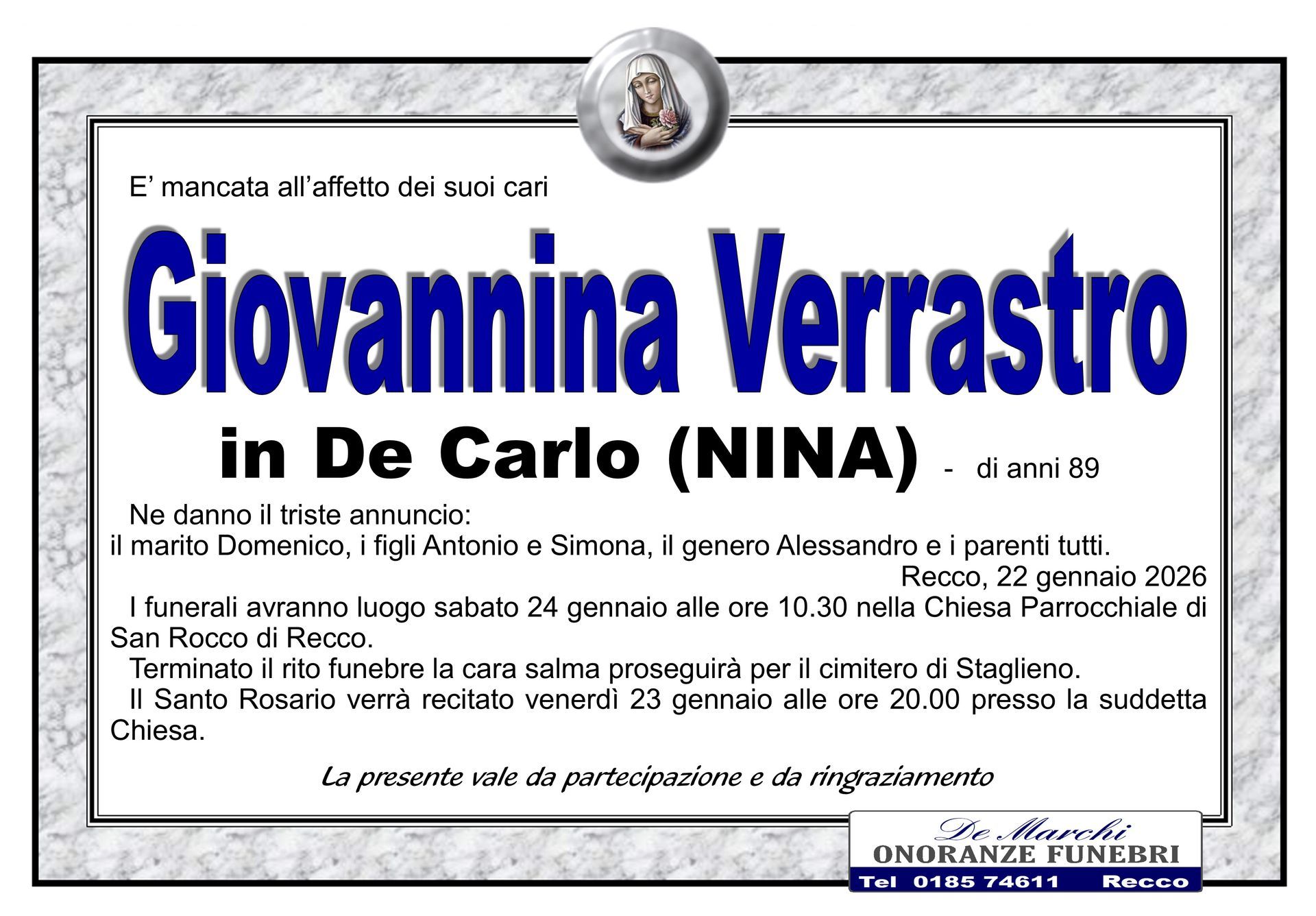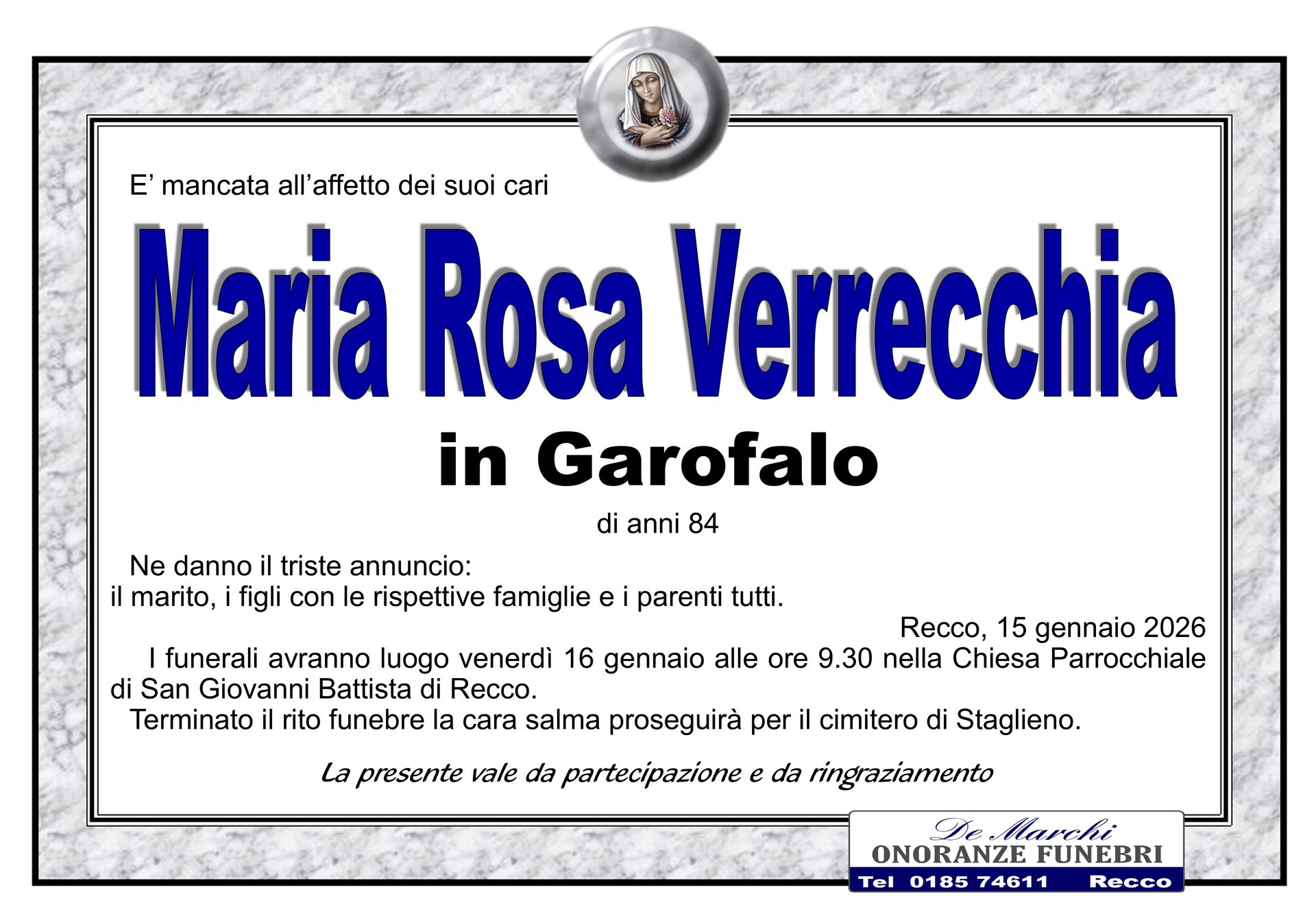 Potete contare sulla professionalità ed esperienza dell’agenzia funebre De Marchi per la stesura e l’affissione di comunicazioni di lutto, per lo svolgimento delle pratiche cimiteriali, per il trasporto della salma da un comune a un altro e per la gestione di qualsiasi aspetto del rito funebre.