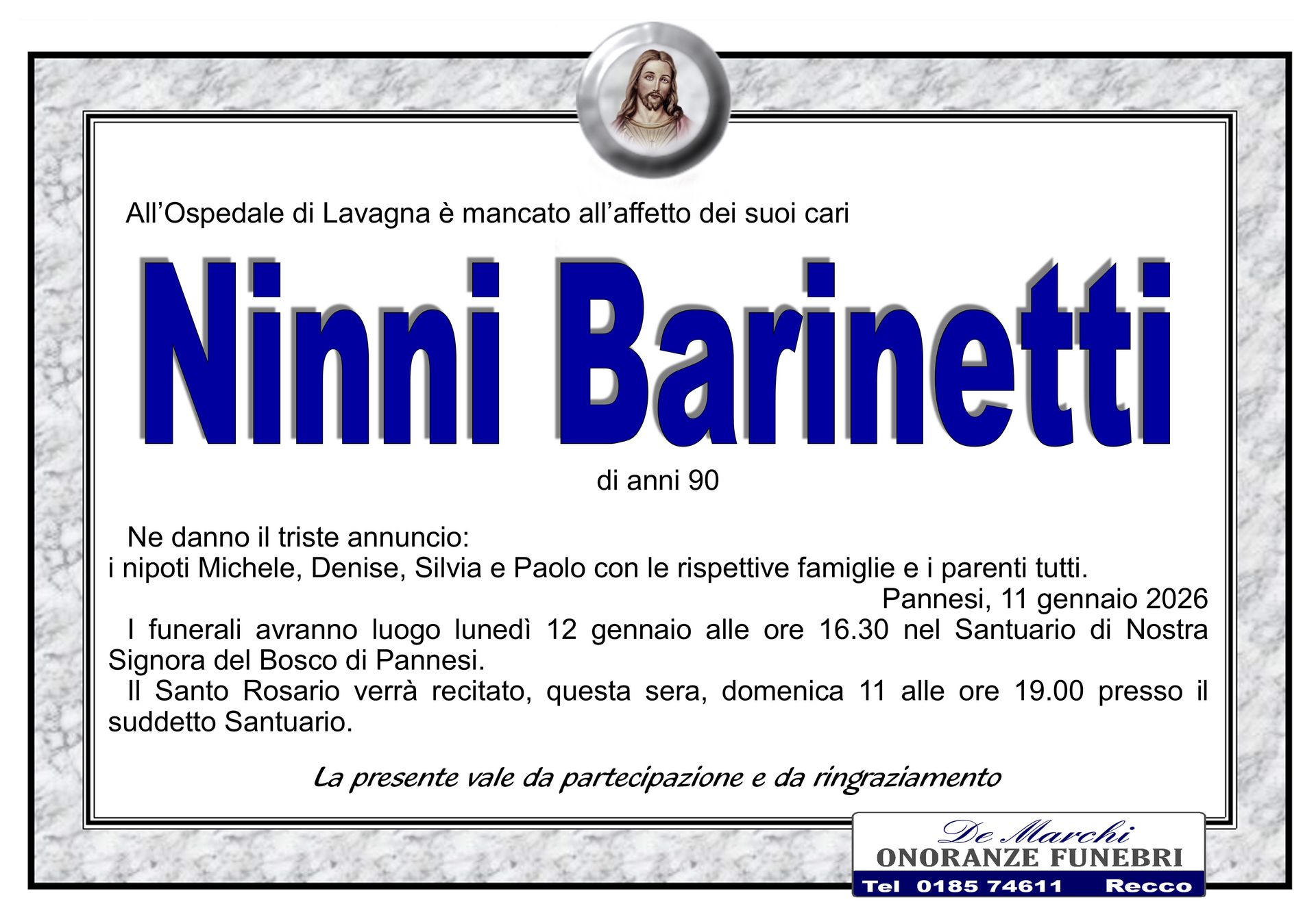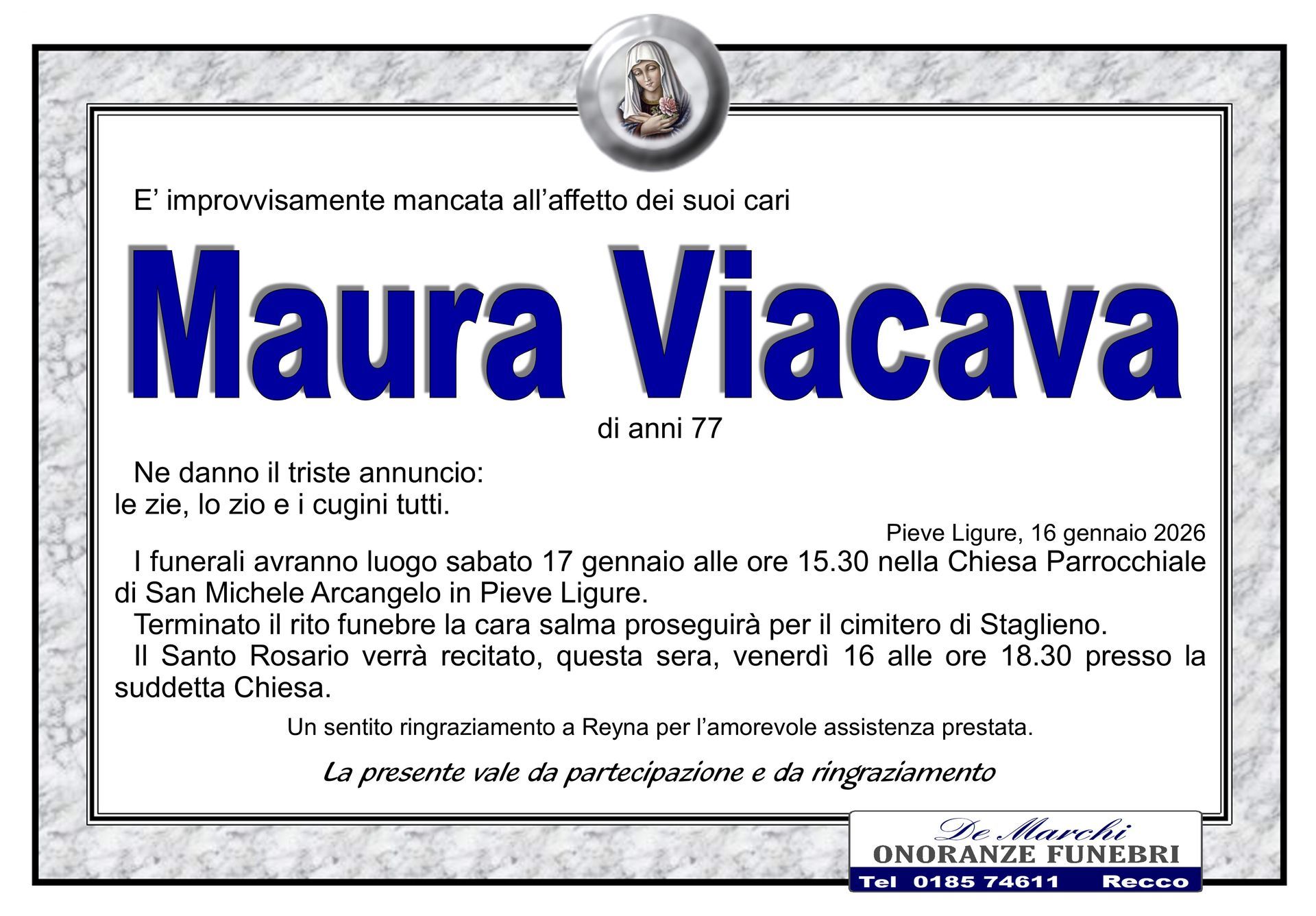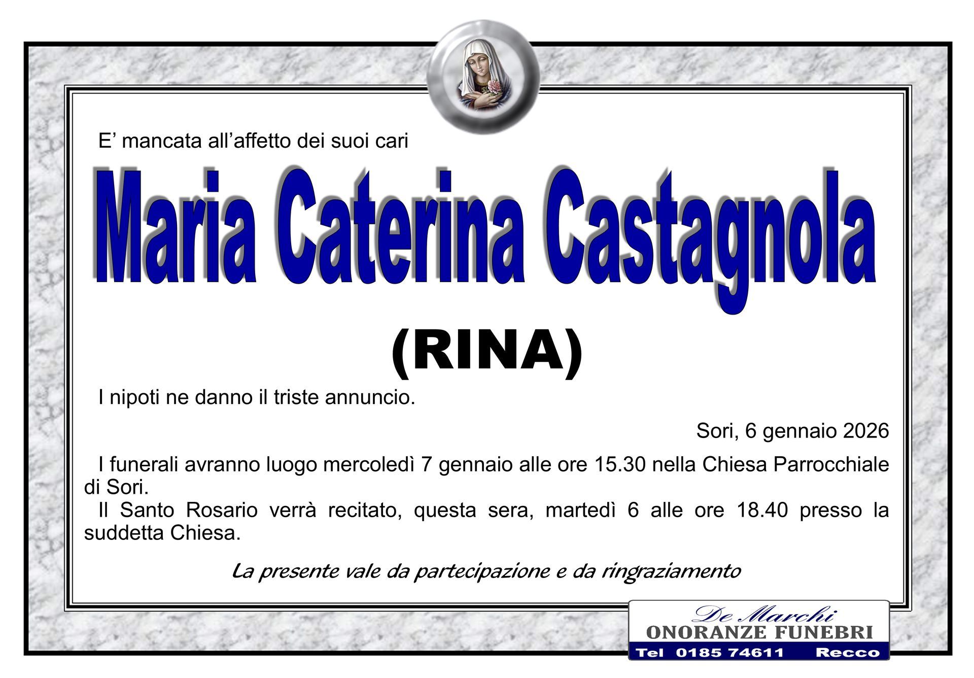 L’agenzia funebre De Marchi si trova nella città di Recco, in provincia di Genova, e opera con grande professionalità in tutti i comuni limitrofi. Grazie a una lunga e decennale esperienza nel campo dei servizi funebri a Recco, oggi il personale dell’impresa è in grado di organizzare cerimonie funebri complete e personalizzate nel dettaglio.
