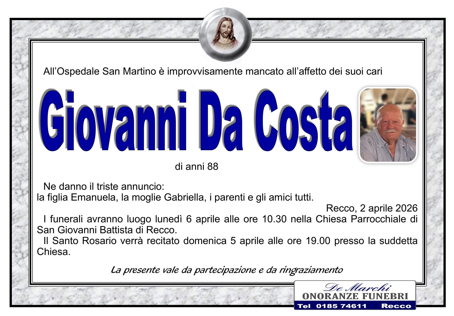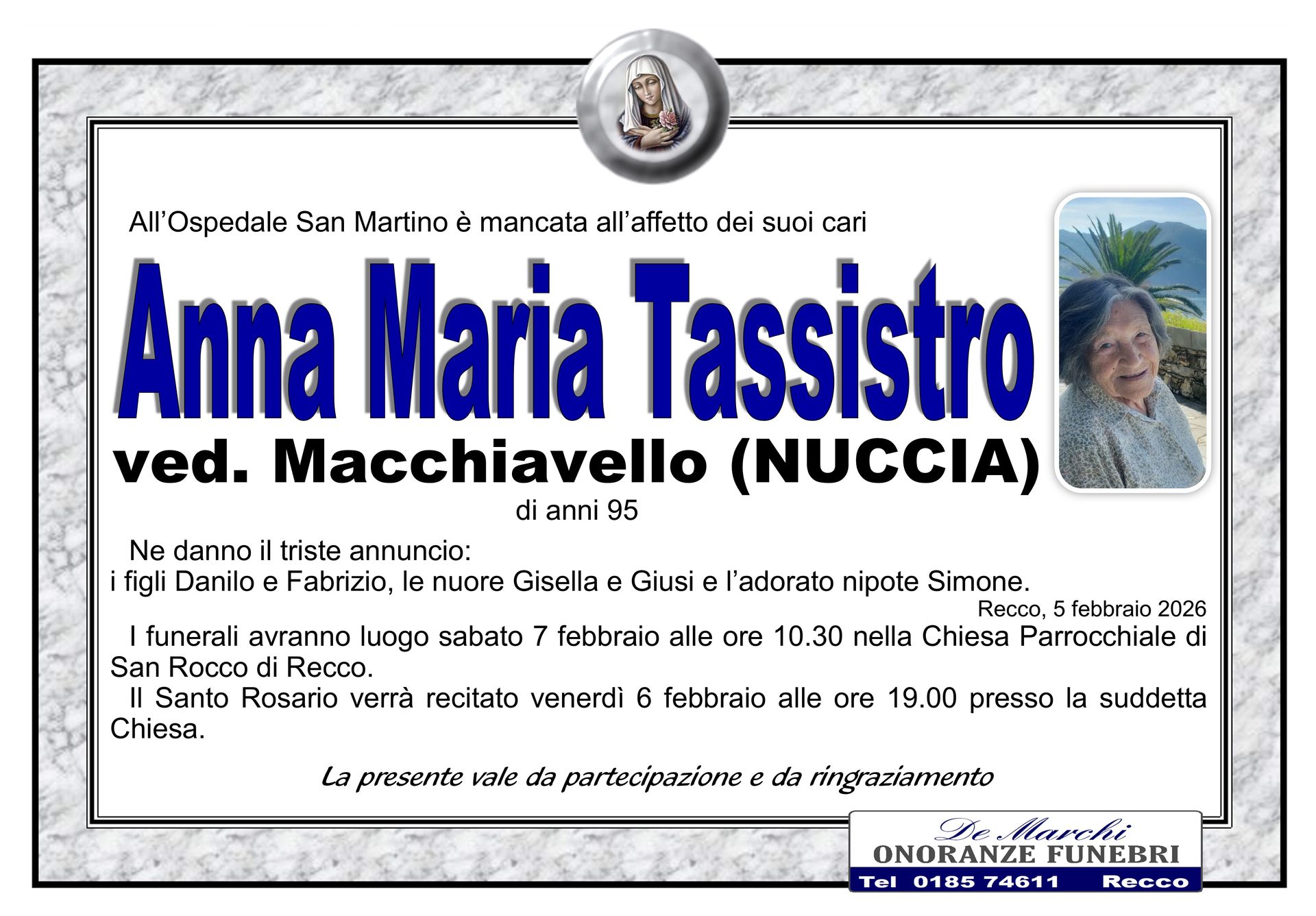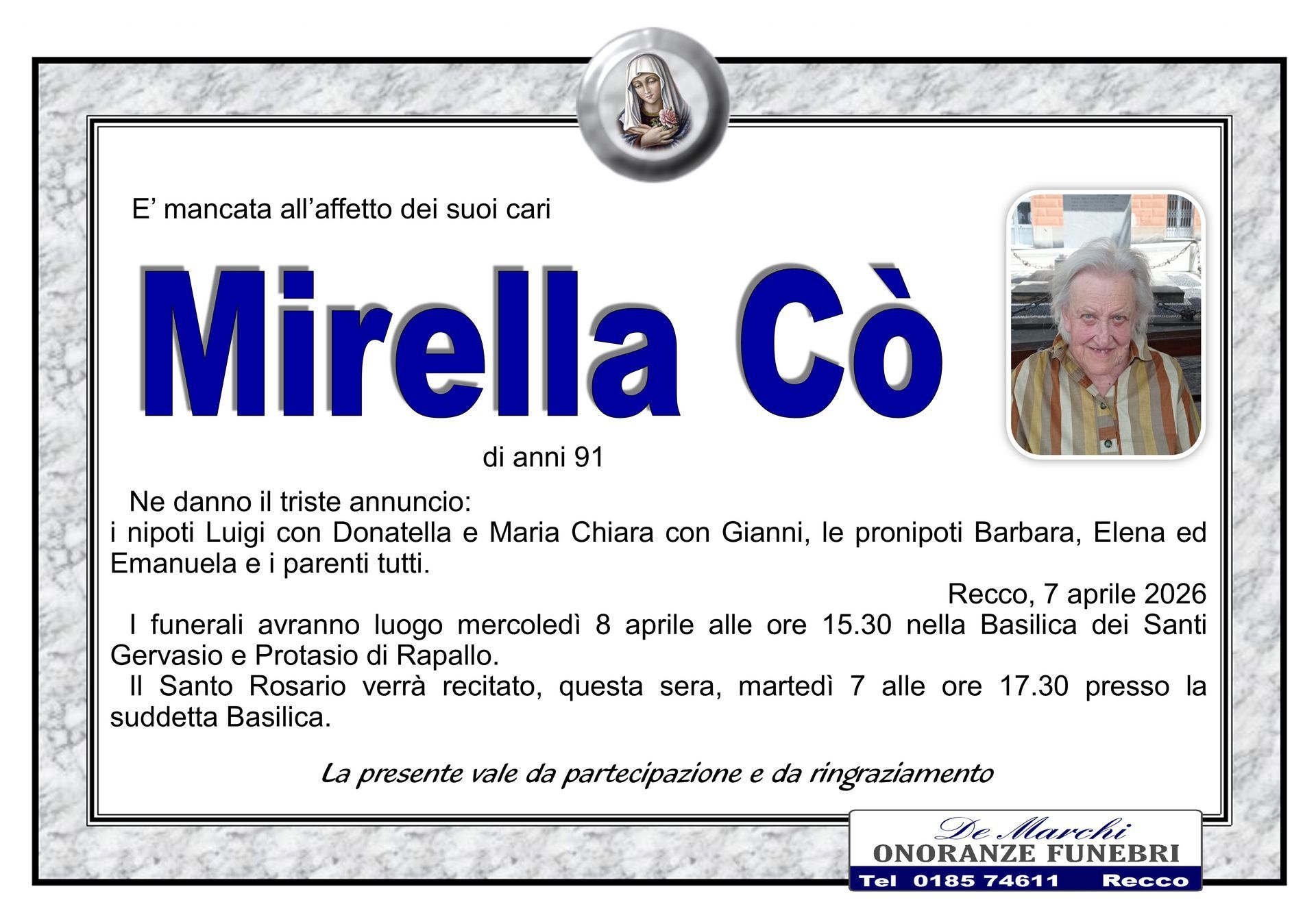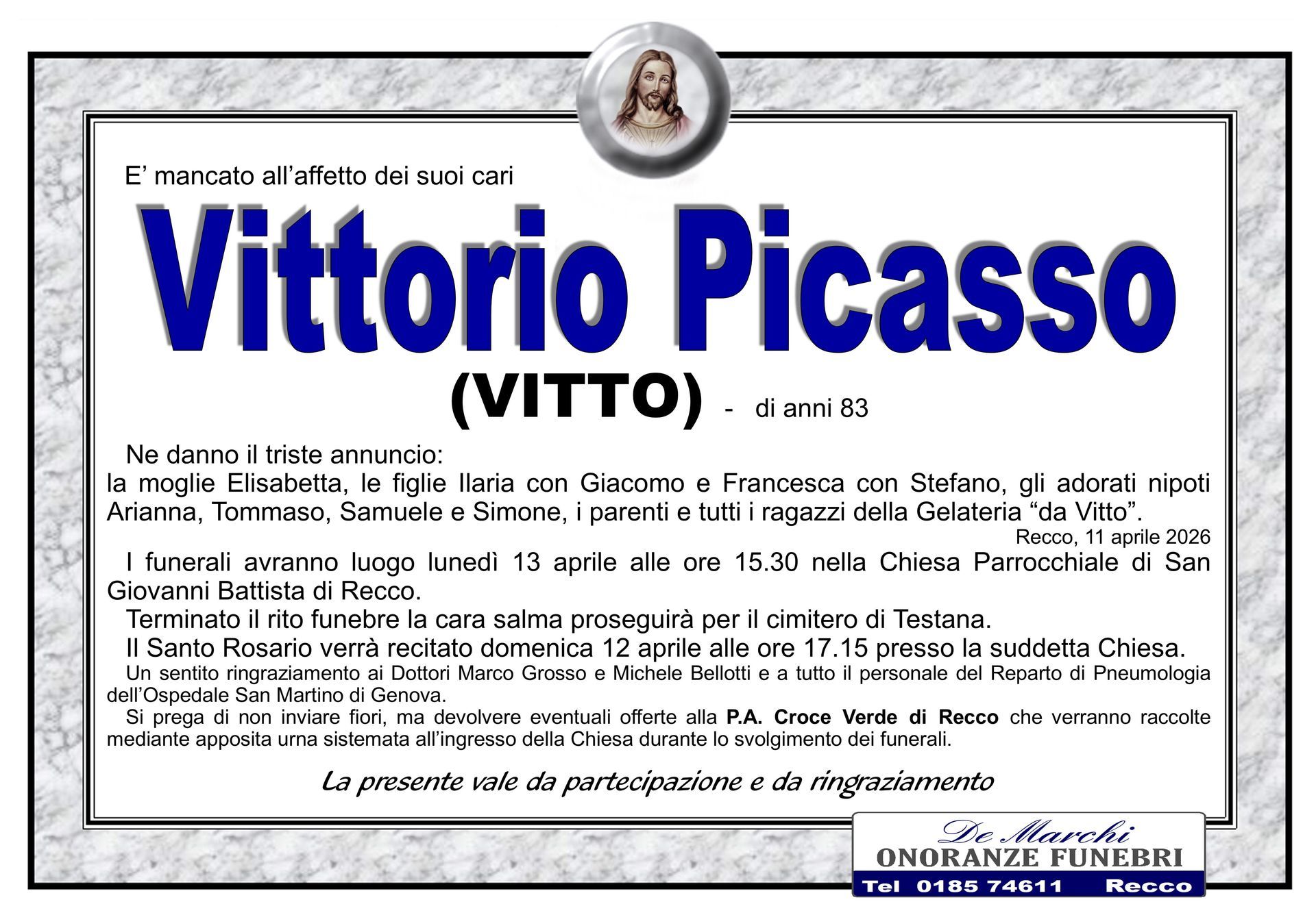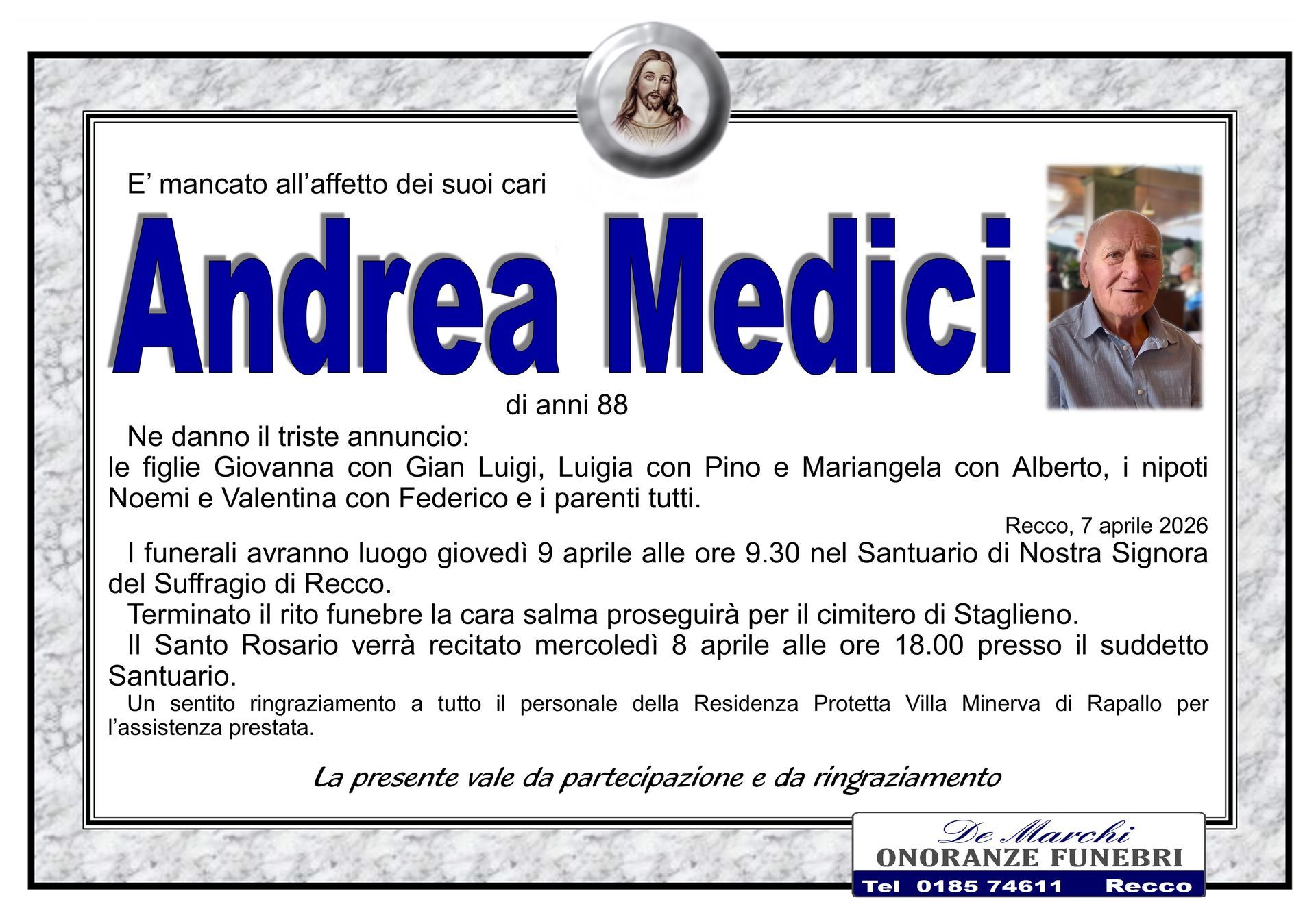 L’agenzia funebre De Marchi si trova nella città di Recco, in provincia di Genova, e opera con grande professionalità in tutti i comuni limitrofi. Grazie a una lunga e decennale esperienza nel campo dei servizi funebri a Recco, oggi il personale dell’impresa è in grado di organizzare cerimonie funebri complete e personalizzate nel dettaglio.
