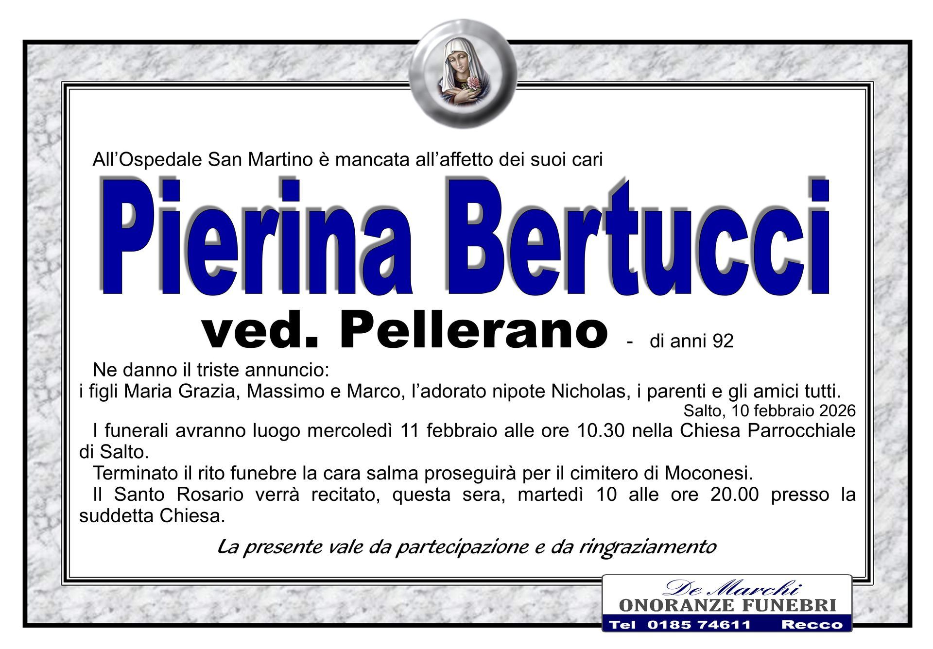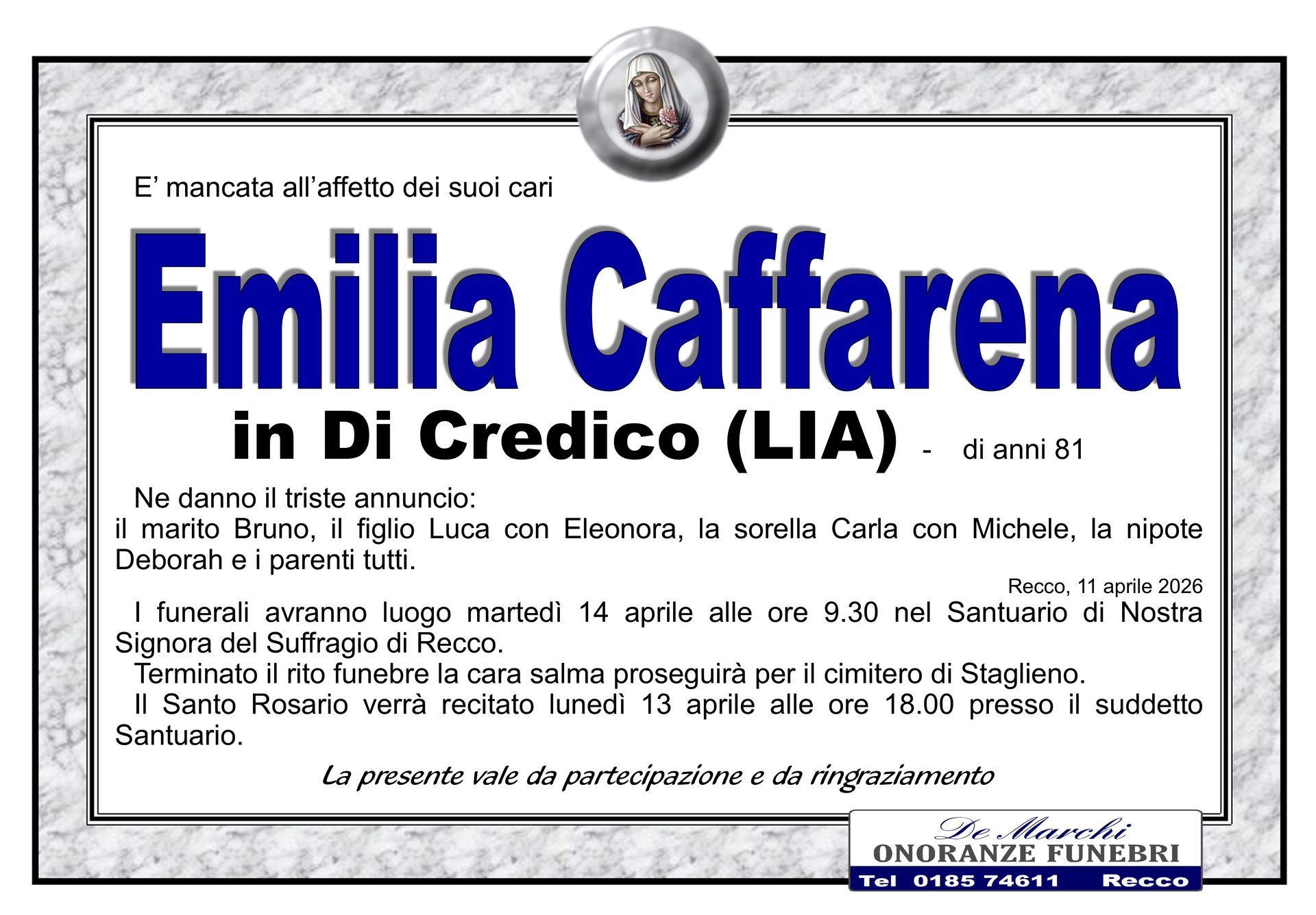 Potete contare sulla professionalità ed esperienza dell’agenzia funebre De Marchi per la stesura e l’affissione di comunicazioni di lutto, per lo svolgimento delle pratiche cimiteriali, per il trasporto della salma da un comune a un altro e per la gestione di qualsiasi aspetto del rito funebre.